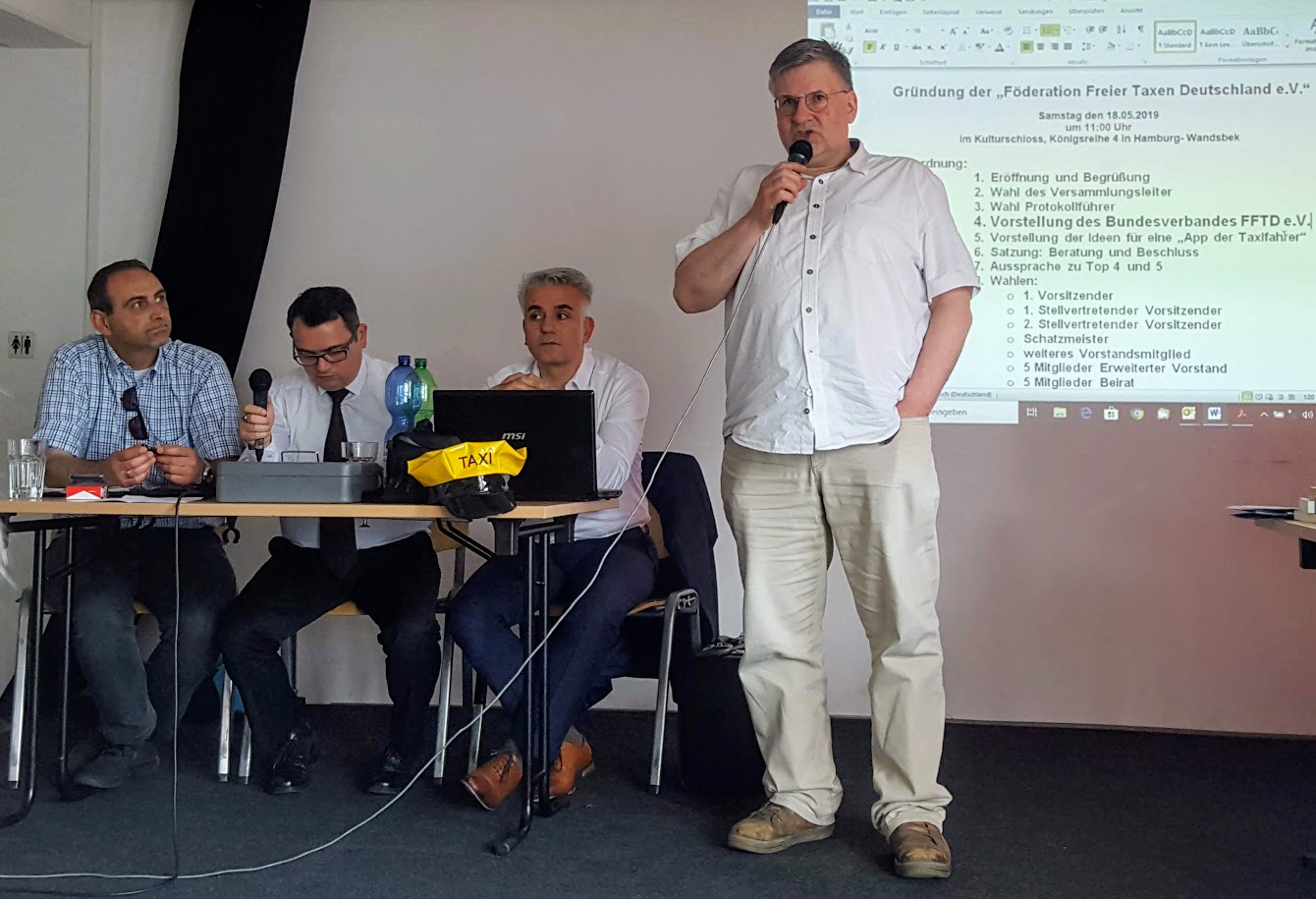 05/2019 Hamburg. Heute, am 18.05.2019 wurde der neue Bundesverband Föderation Freier Taxen Deutschland e.V. im Kulturschloß, Königsreihe 4, im Hamburger Stadtteil Wandsbek gegründet. Dabei wurden die Ziele und Aufgaben des Bundesverband FFTD e.V. vorgestellt sowie die rechtskräftige Gründung vollzogen. Ein zentraler Punkt der Gründungsversammlung war die Vorstellung und Diskussion des Projektes "App der Taxifahrer", also die Idee einer gewerbeeigenen Vermittlungs-Plattform. Ziel ist der Beginn eines Testbetriebes noch im September diesen Jahres.