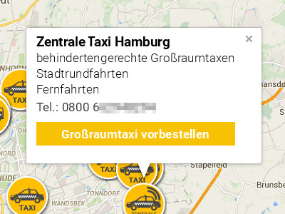 Taxiunternehmen / (Funk-) Taxizentralen erhalten auf der hallo.TAXI-Map ein feststehendes Symbol mit folgenden Angaben: